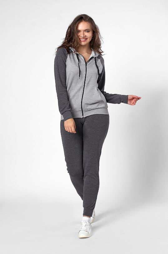 Жіночий трикотажний спортивний костюм, складається із кофти та штанів, виготовлений з трикотажа двохнитки. Кофта прямого покрою, з капюшоном і кишенями. Довгий рукав покрою релан. Низ кофти, низ рукава і низ штанів - з манжетами. Застібка центральна на тасьму блискавку. Штани - прямого покрою, злегка завужені. Пояс штанів вистрочений з еластичною тасьмою. Практичний варіант для прогулянок, спорту, подорожей та відпочинку.