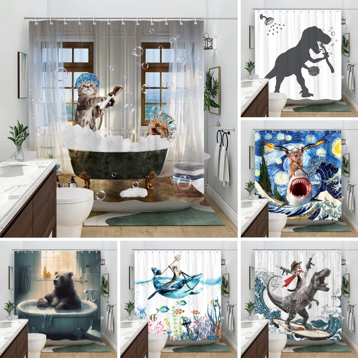 Забавный кот в ванне, ванной, шторы для душа из полиэстера с мультяшным рисунком, тираннозавр рекс, волнистые шторы, декор для ванной комнаты