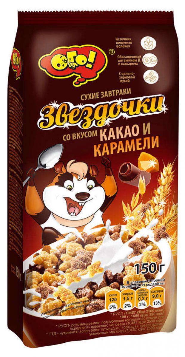 Ого! Сухой завтрак звездочки со вкусом какао и карамели, 150 г. Вкусный завтрак для детей, с высоким содержанием кальция и витамина D, источник пищевых волокон, цельнозерновая мука 40%.