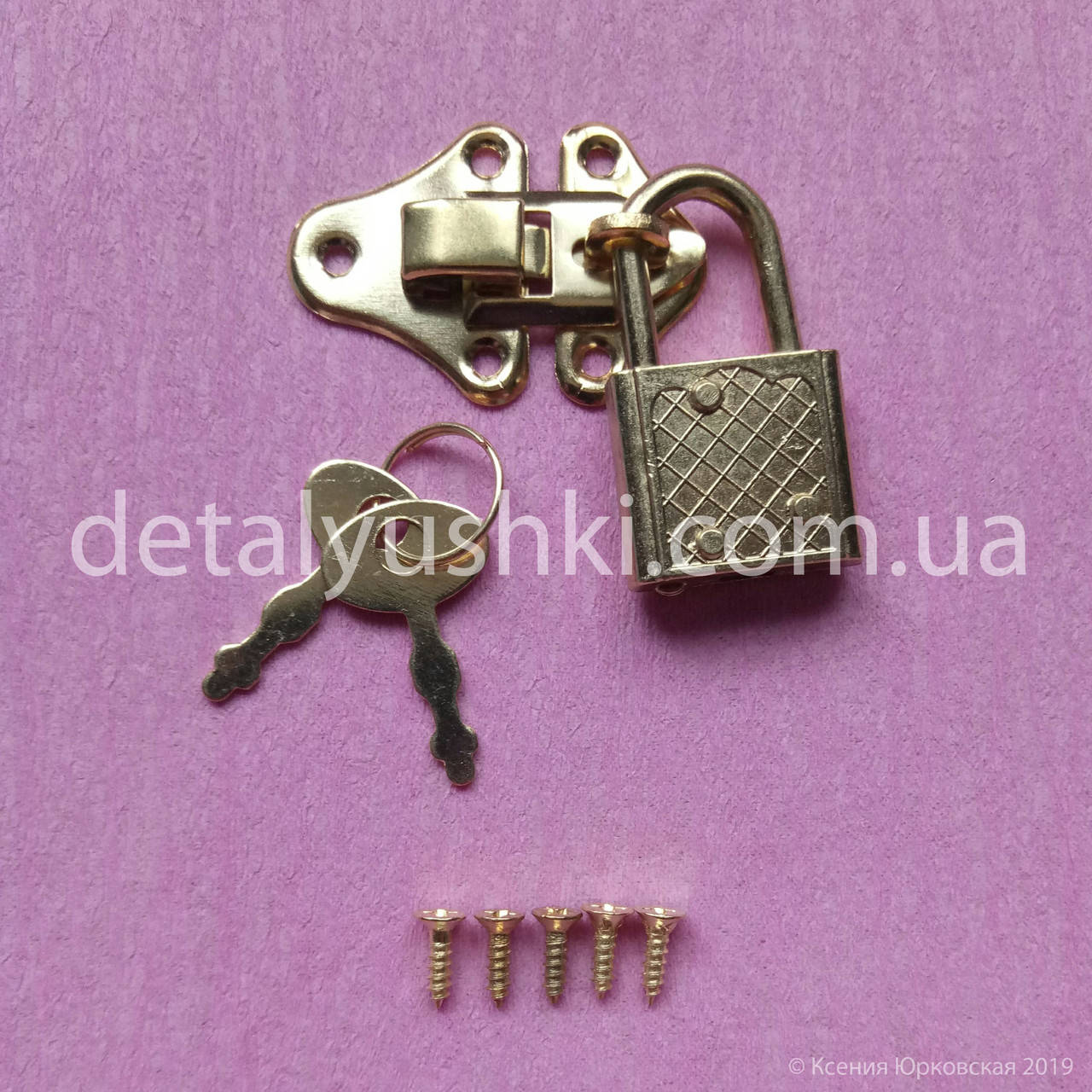 В набор входит : навес для замочка 1 шт, замочек 1 шт, ключики 2 шт на кольце, саморезы 5 шт