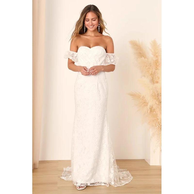 Заказ внешней торговли Трехмерный цветок Лу с открытыми плечами Элегантное персонализированное банкетное легкое свадебное платье Светская львица Со шлейфом Торжественное платье Платье White XL