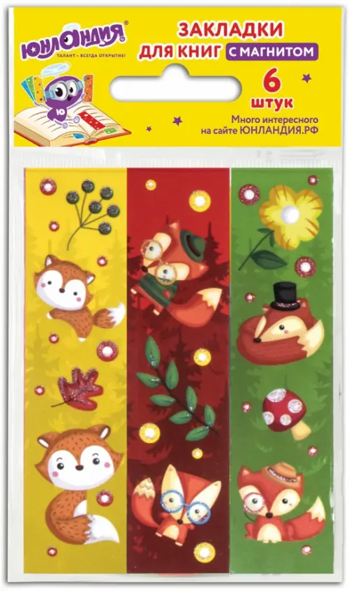 Закладки для книг с магнитом Лисята, 6 штук, 25x196 мм, блестки, Мультиколор