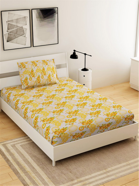 Salona Bichona White & Yellow Floral 144 TC Cotton 1 Single Bedsheet with 1 Pillow Covers