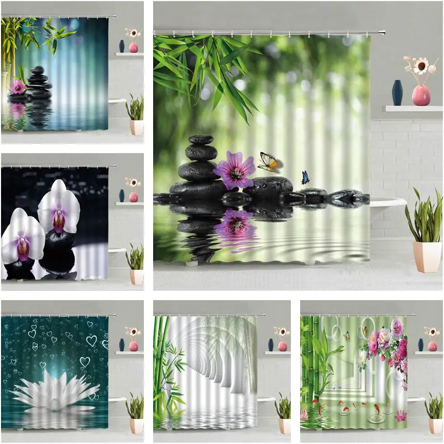 Занавеска для душа с бамбуковыми листьями, бабочками, цветами лотоса
