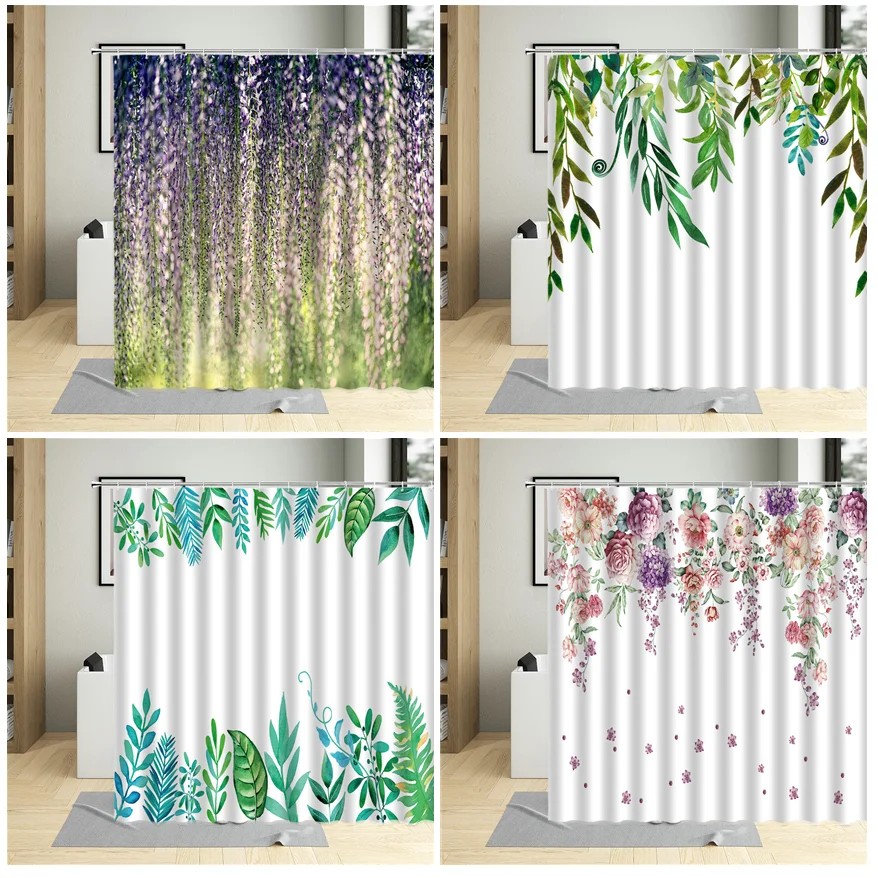 Занавеска для душа, с зелеными цветами, листьями и крючками, из полиэстера