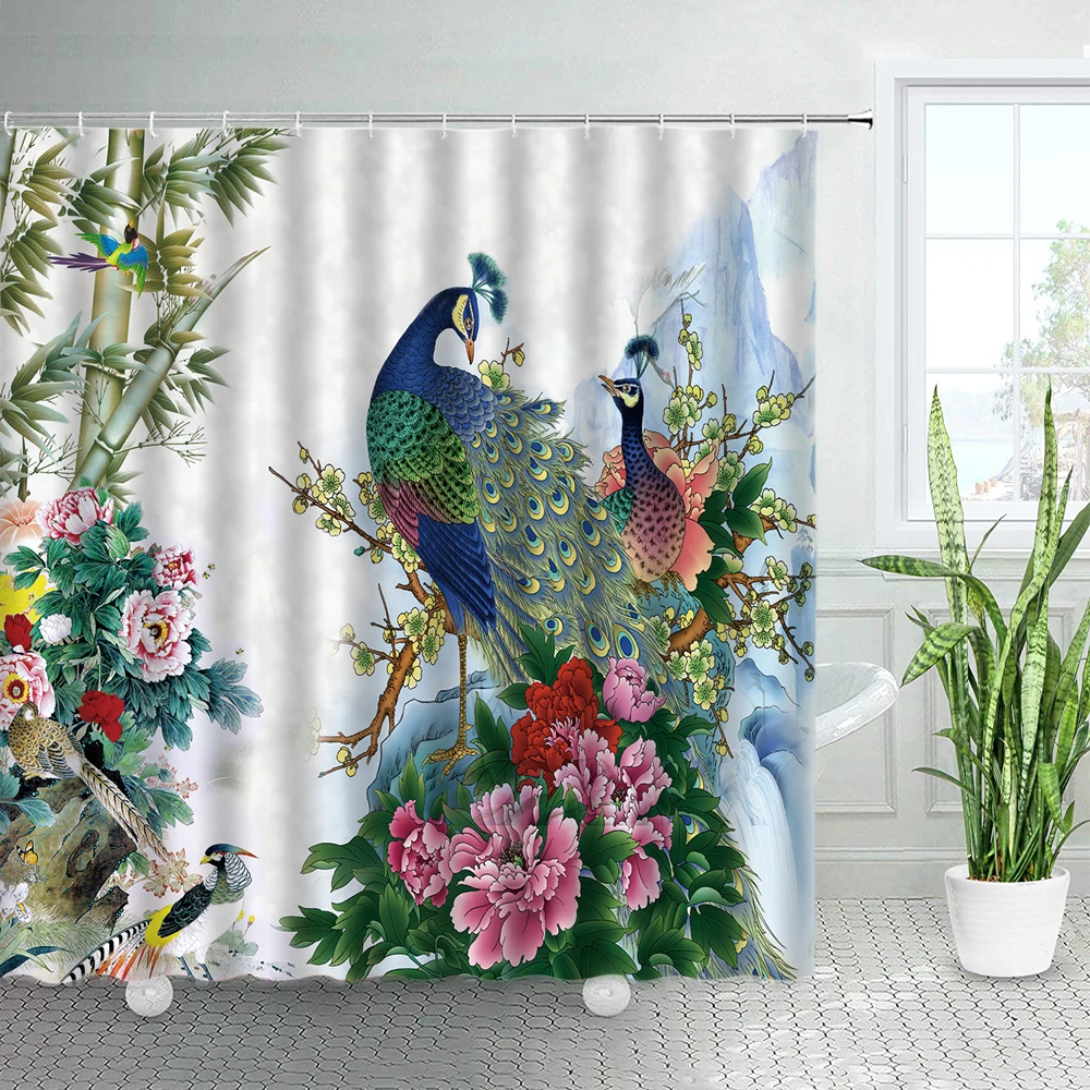 Занавеска для душа с принтом из зеленых бамбуковых павлинов