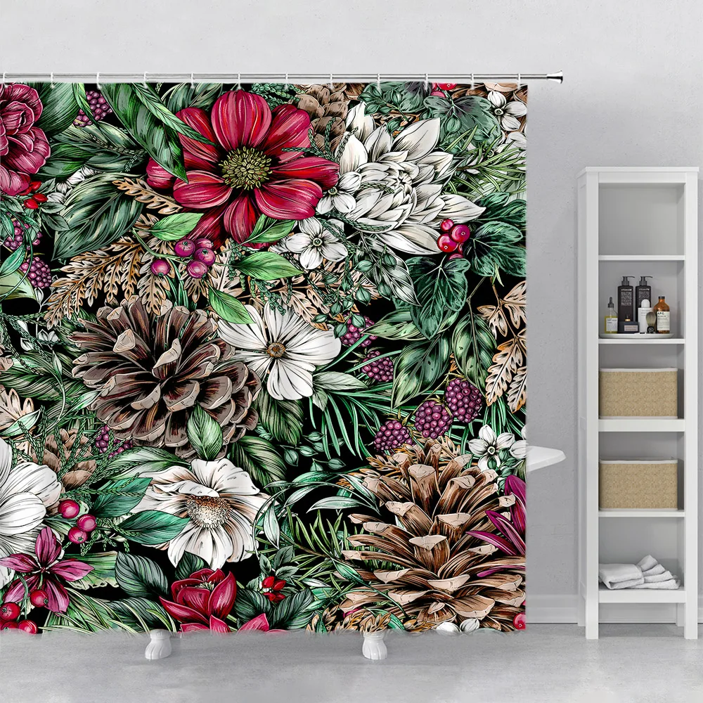 Занавеска для душа с рисунком красных и белых цветов и зеленых листьев