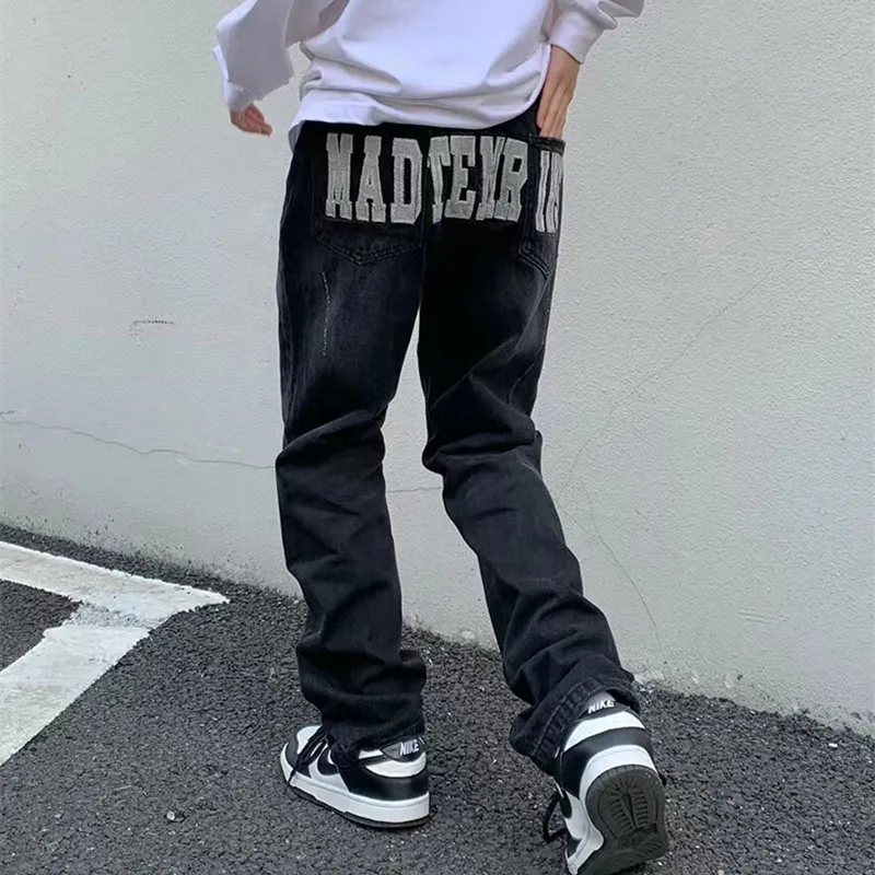 2022 2022 темные уличные черные винтажные мужские мешковатые джинсовые брюки с Вышивкой Букв, прямые джинсовые брюки в стиле хип-хоп Y2K