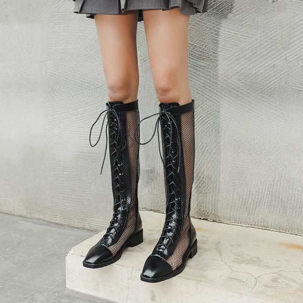 летние коленные высокие полые сапоги дышащие полые сапоги круглый носок крест ремешок на шнуровке воздуха, Black