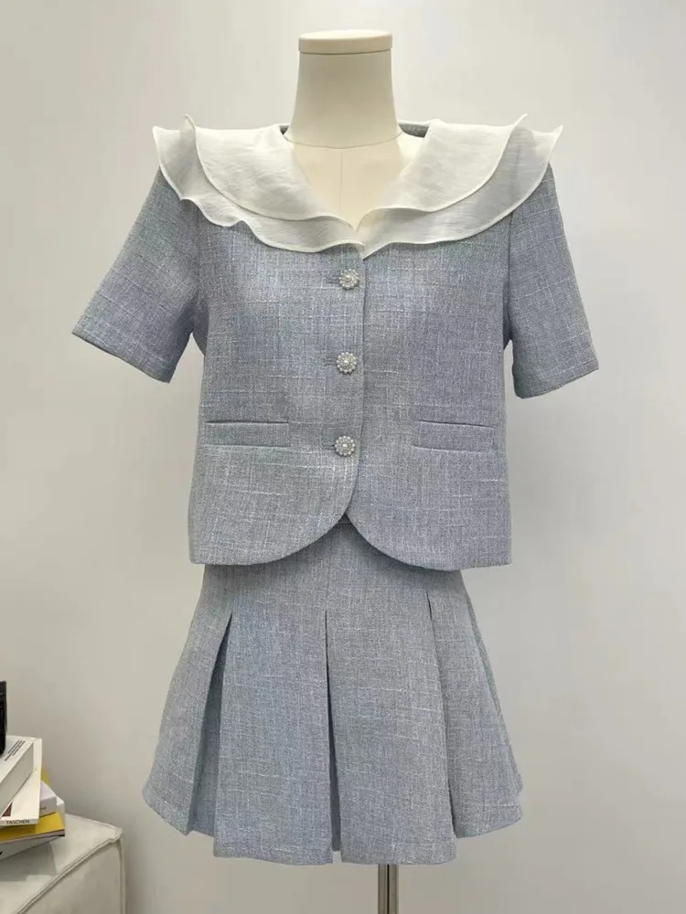 2023 Summer New Sweet Double Ruffled Collar Sweet High Waist Single-Breasted Tops + High Waist Pleated Skirt Two-Piece Set Women