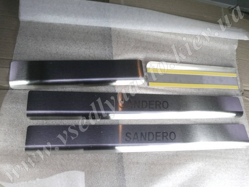 Накладки на пороги Renault SANDERO Защитные накладки на пороги из нержавеющей стали. Толщина накладок 0,5 мм. Установка на двухсторонний немецкий скотч, который уже приклеен на накладках. Присутствуют оригинальные надписи на накладках. Купитьт модельные накладки на пороги можно позвонив нам по телефону или оформив заказ через корзину. Накладки на пороги Renault SANDERO Накладки на пороги Рено Сандеро 2008-. Материал - нержавеющая сталь. Накладки на пороги Рено Сандеро STANDART Нержавеющая сталь толщиной 0,5 мм Надпись шлифованная на передних накладках. Двухсторонний скотч LOHMAN (Германия). Односоставная упаковка белого цвета. Накладки на пороги Renault SANDERO