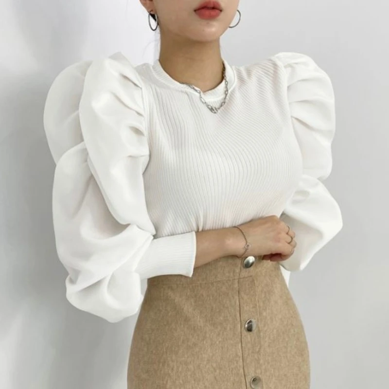 Новинка 2021, осенняя Элегантная футболка, женская одежда, футболка в стиле Харадзюку, однотонная черная трикотажная Женская Футболка с рукав...