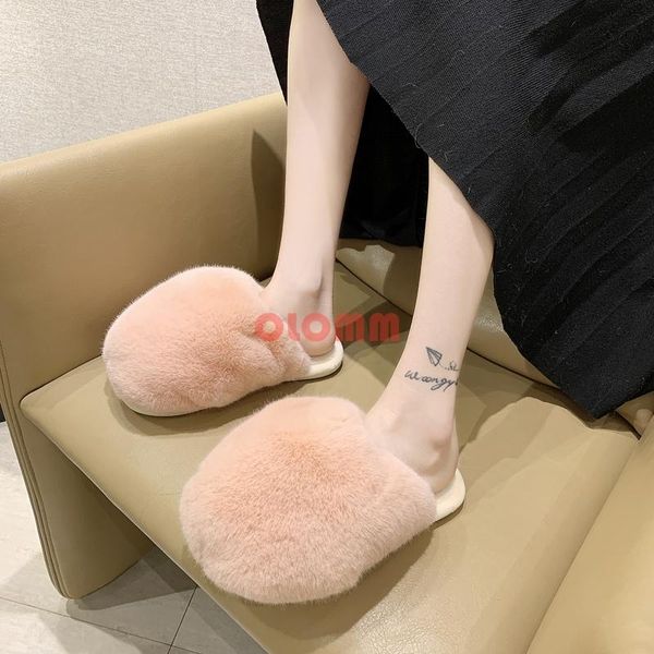 summer women slippers faux fur slides for fluffy house female shoes woman with pom pon furry, Black