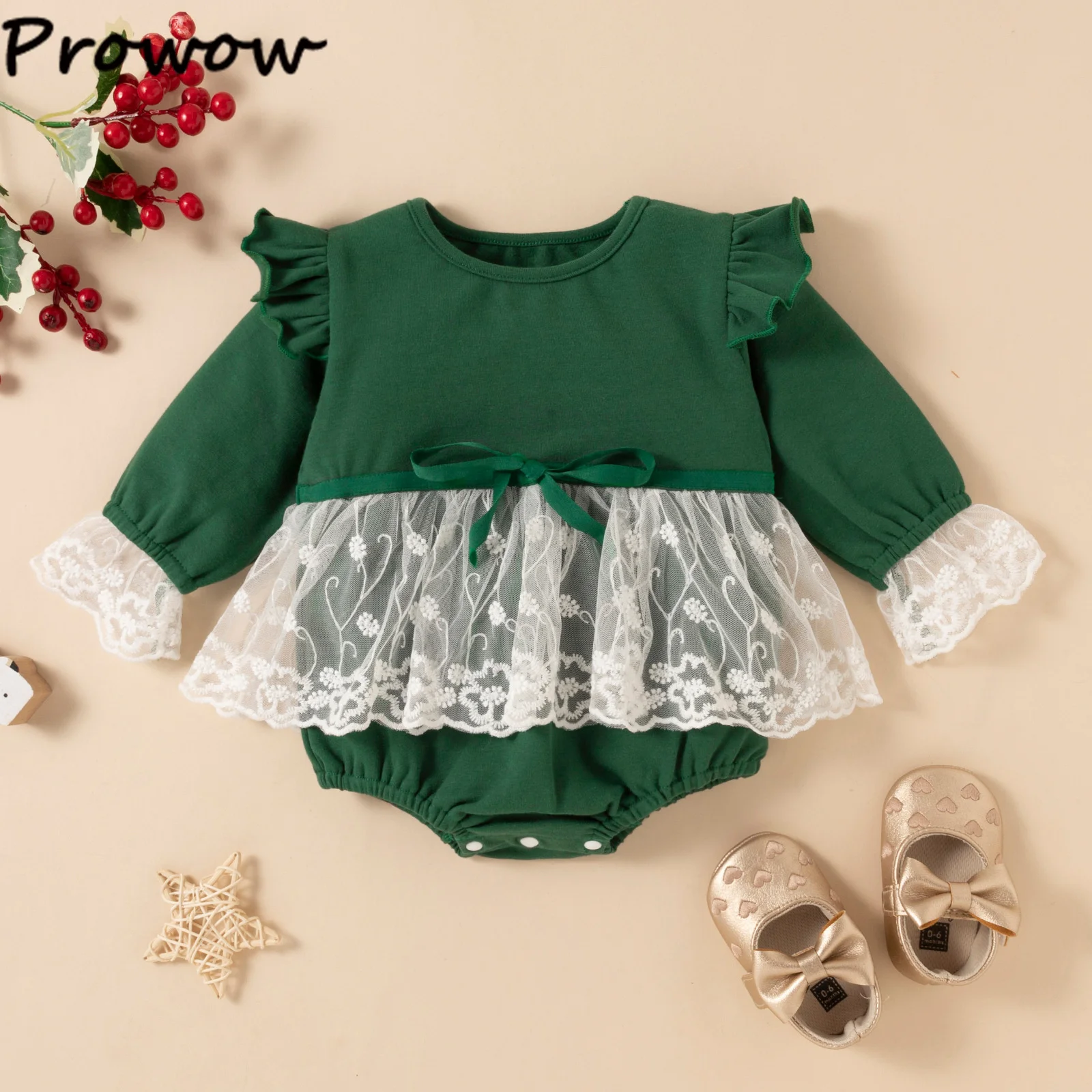 Зеленое рождественское платье для маленьких девочек Prowow, цветочное кружевное платье с бантом и расклешенными рукавами, боди для младенцев, ...