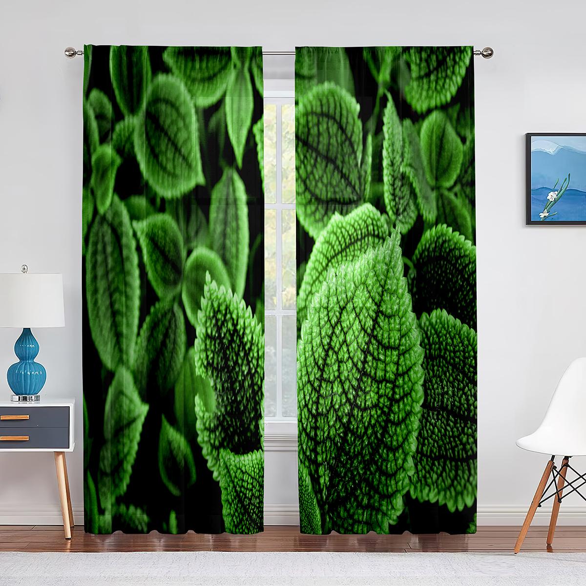 Зеленые листья, синяя прозрачная вуаль, занавеска для спальни, гостиной, кухни, современное украшение, растительная шифоновая драпировка, тюль, оконная занавеска 1 PCS W100XH250cm&Grommet Top