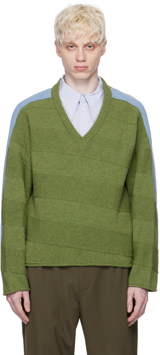 Зеленый делийский свитер. Свитер из натуральной шерсти лицевой и изнаночной вязки.Вязаный V-образный вырез в резинкуЗавернутый край по низу и манжетамЗаниженная линия плечаПолосатая отделка на рукавах Цвет поставщика: Зеленый меланж/Синий меланж 100%...