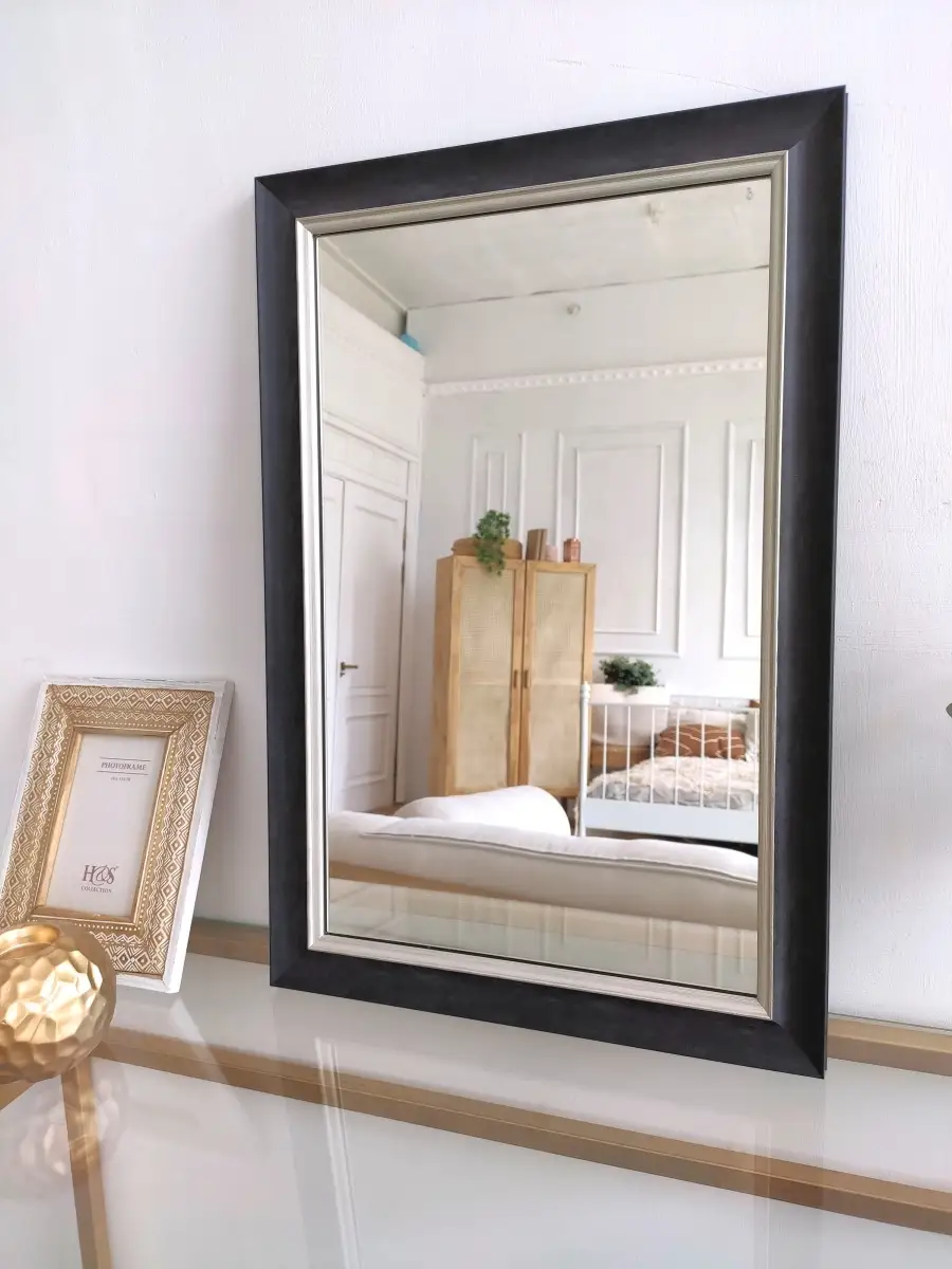 Зеркало в очень красивом багете с перламутровым оттенком, благодаря которому зеркало в такой раме имеет богатый металлический блеск и переливы цвета. Качественное зеркальное полотно влагостойкое, толщиной 4мм, Японской марки AGC и рама из качественного полистирола позволяет использовать это зеркало не только для интерьера гостиной или прихожей, но и для ванных комнат. На зеркало с тыльной стороны нанесена защитная противоосколочная пленка. Ширина багета - 4.3см, видимая часть зеркала 31.4х51.4см. Возможна установка как в горизонтальном, так и в вертикальном положении. Размер указан вместе с рамкой.