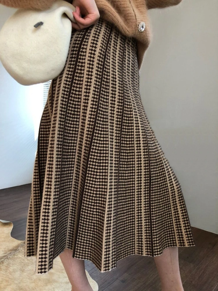Зимние вязаные юбки для женщин, полосатые клетчатые винтажные юбки с высокой талией, утепленные трапециевидные элегантные офисные женские ...
