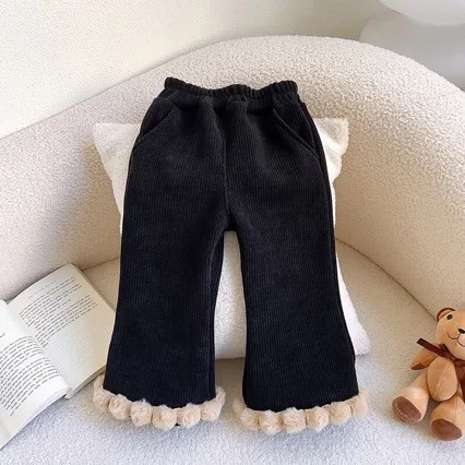 Зимние детские штаны для девочек 2023, хлопковые флисовые утепленные брюки с шариковым подолом для маленьких девочек, однотонные штаны для отдыха с эластичным поясом для маленьких девочек
