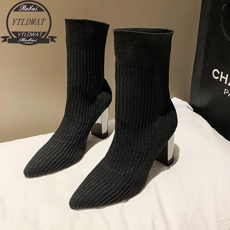 Зимние женские ботинки, вязаные эластичные ботинки, женская модная обувь на высоком каблуке, сезон весна-осень 2023, женские ботильоны
