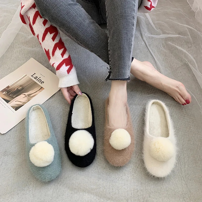 Зимние женские туфли на плоской подошве, плюшевые тапочки, модная обувь Baotou с помпоном, женская обувь на плоской подошве, бархатные комнатны...