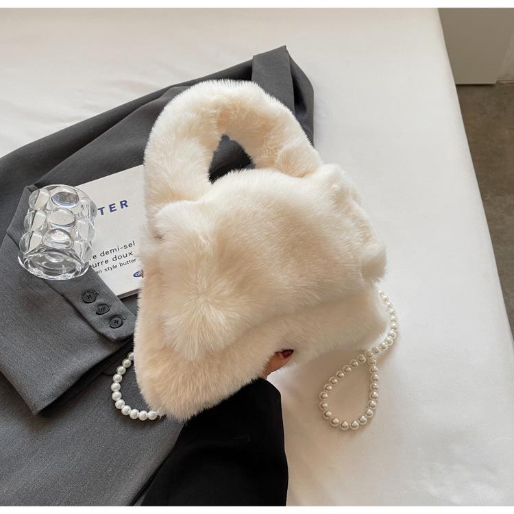 Зимние новые модные женские сумки через плечо, симпатичная мягкая роскошная плюшевая маленькая сумка через плечо с жемчужной цепочкой, женская сумка-клатч с высокой текстурой, повседневная женская сумка-клатч слоновая кость