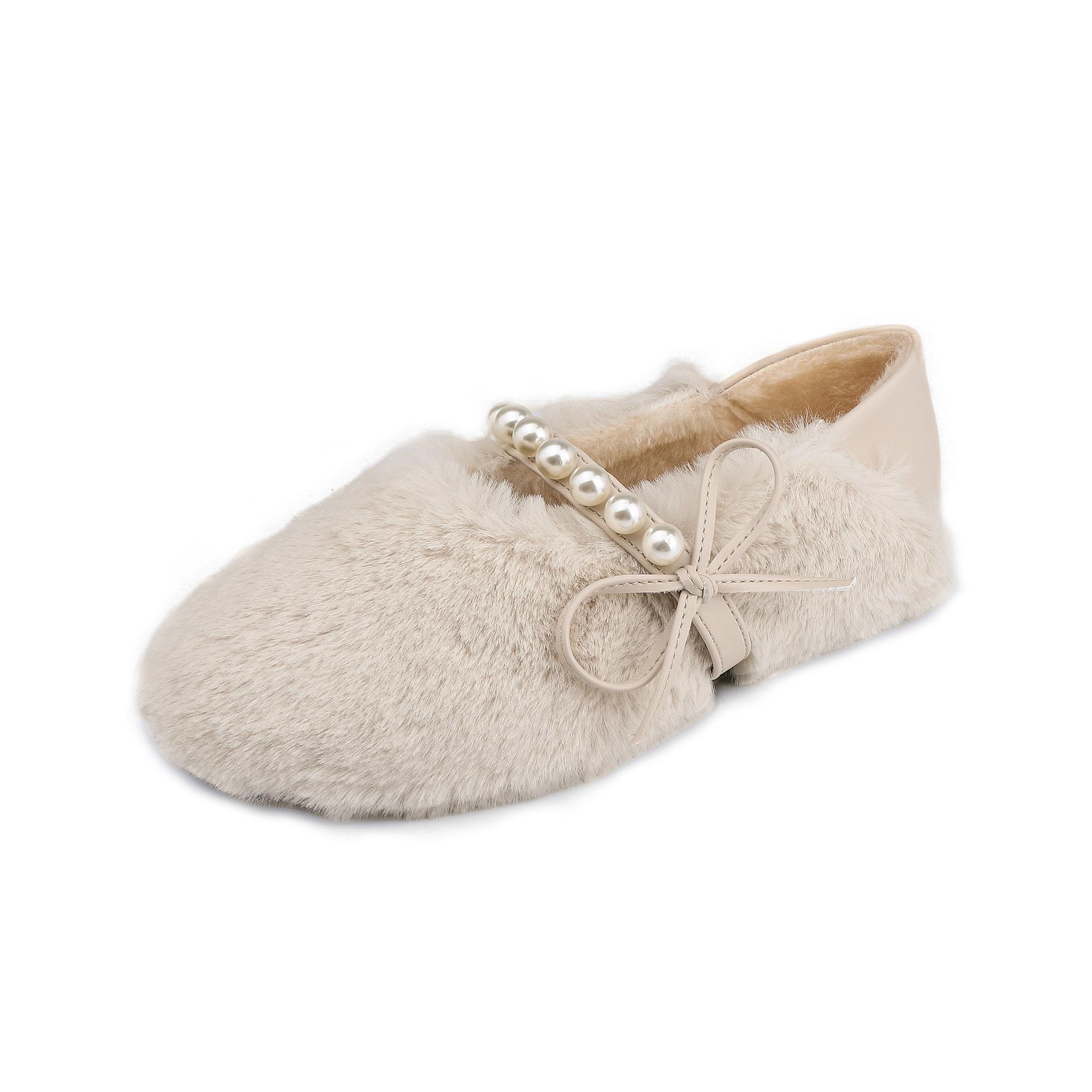 Зимние новые плюшевые туфли Мэри Джейн, женские модные универсальные термотуфли с жемчугом, задняя плюшевая повседневная плоская хлопковая обувь 42 слоновая кость