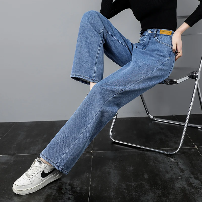 Зимние утепленные брюки, прямые джинсы, женские свободные повседневные джинсы, женские широкие брюки с высокой талией и Leng, 23555