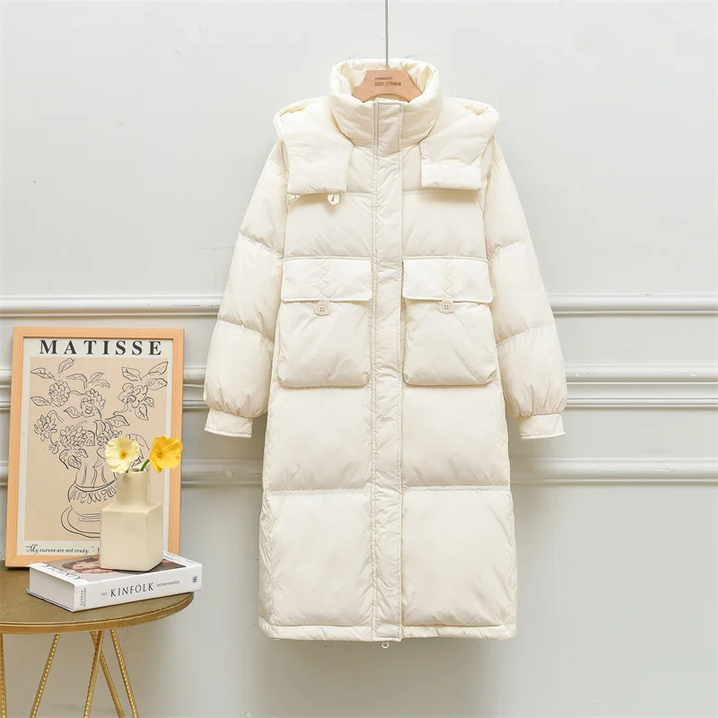 Зимний женский пуховик средней длины с капюшоном на молнии с длинным рукавом пальто на утином пуху Повседневная модная прямая однотонная верхняя одежда