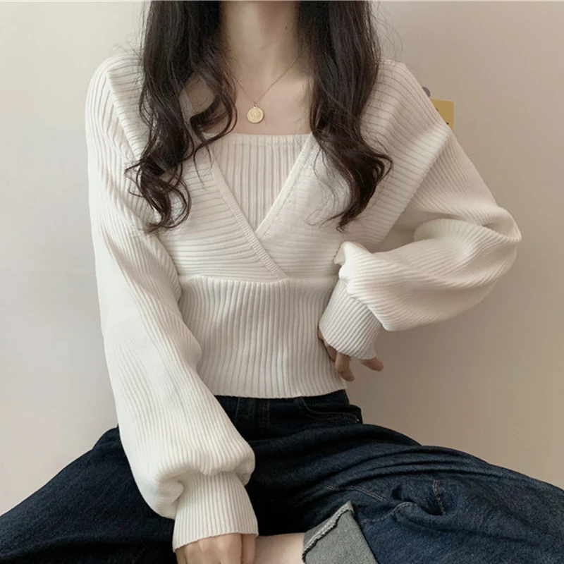 Зимний женский свитер с квадратным вырезом, короткий Стильный однотонный вязаный пуловер, Женская Повседневная модная уличная одежда с дли...