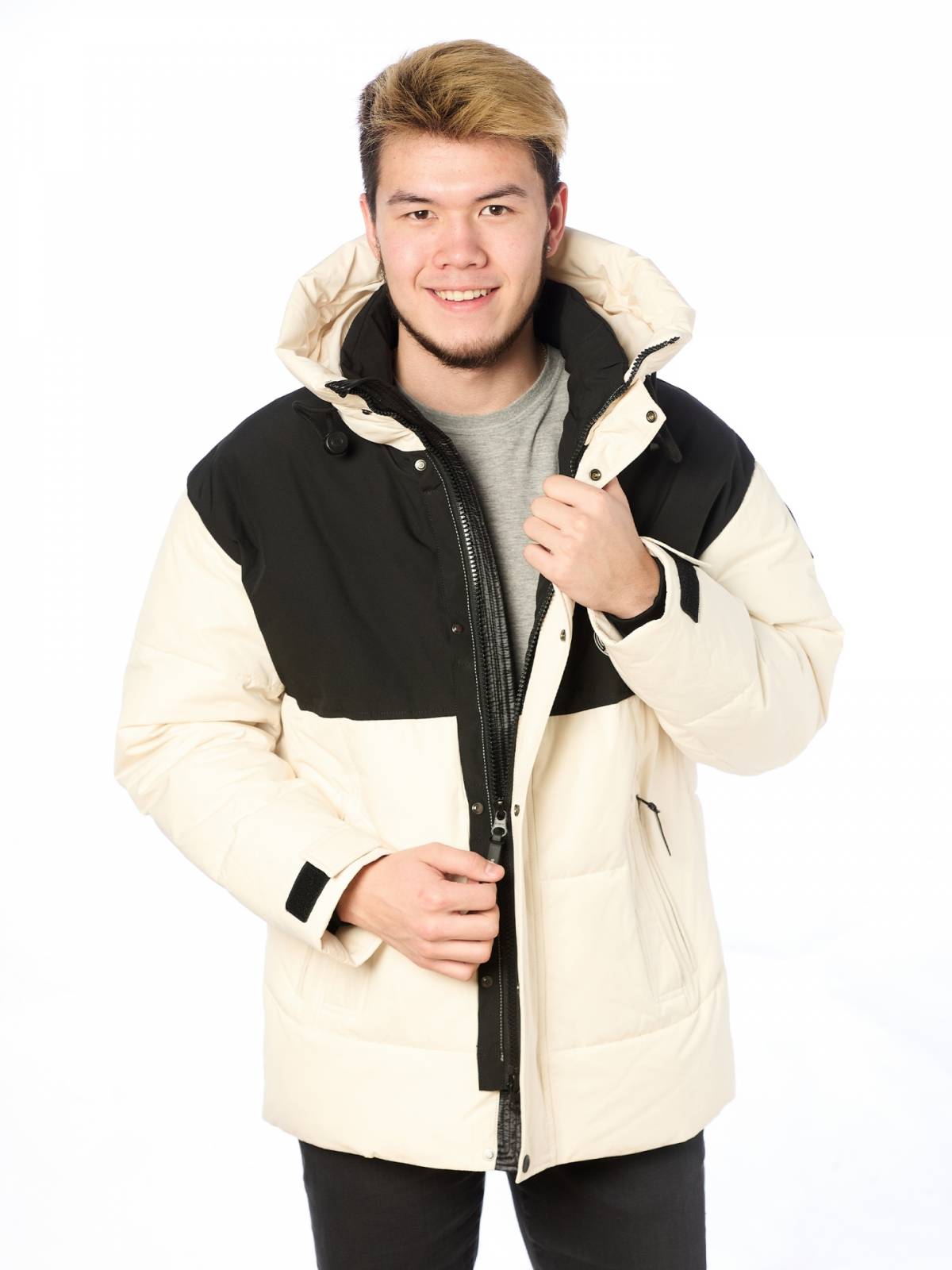 Стильная мужская зимняя куртка, комбинированная модель, центральная молния с ветрозащитной планкой на кнопках, внутренний воротник, воротник стойка, переходящий в несъемный регулируемый капюшон, один нагрудный карман на молнии, два боковых двойных кармана на молнии и кнопке, два внутренних кармана, внутренний трикотажный манжет, манжет рукава регулируется шлевкой на липе, на рукаве брендированная нашивка. Верх: 100% полиэстер; подклад: 100% нейлон; наполнитель: 100% полиэстер (sustans - синтетический биопух нового поколения).