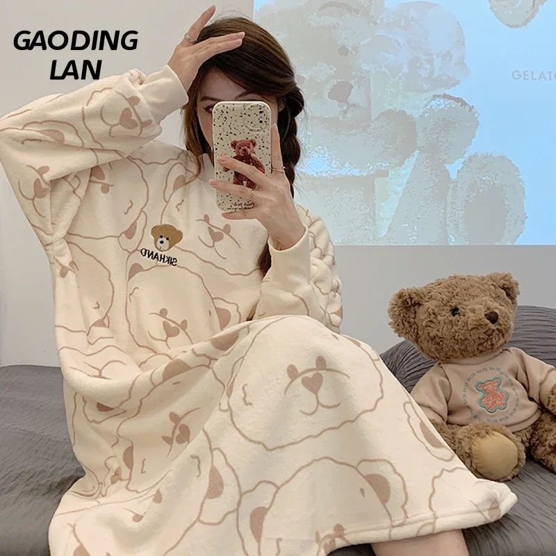 Зимняя плотная теплая Женская фланелевая ночная рубашка с длинным рукавом мультяшный большой медведь женская Коралловая бархатная ночная рубашка Милая домашняя пижама