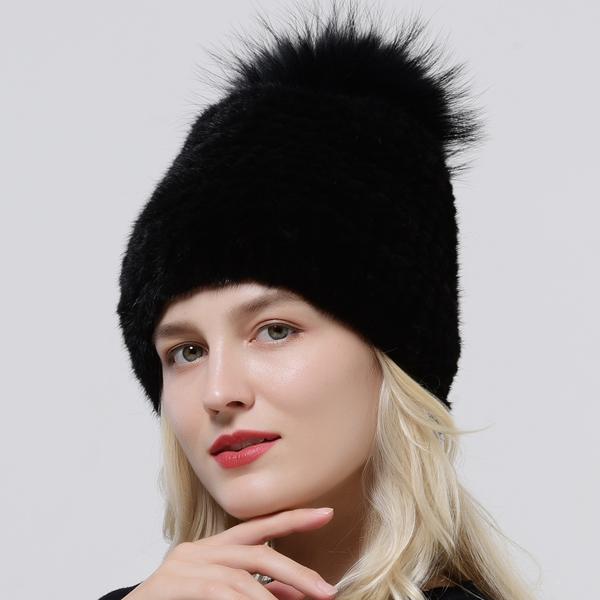Зимняя теплая женская шапка, вязаная из меха норки и лисы, с помпоном, шапки из натурального меха высокого качества One Size чёрный