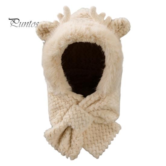 Зимняя шапка с интегрированным шарфом, декор в виде рогов оленя, плотный плюш, полная защита, вязаный эластичный однотонный головной убор для активного отдыха на открытом воздухе бежевый