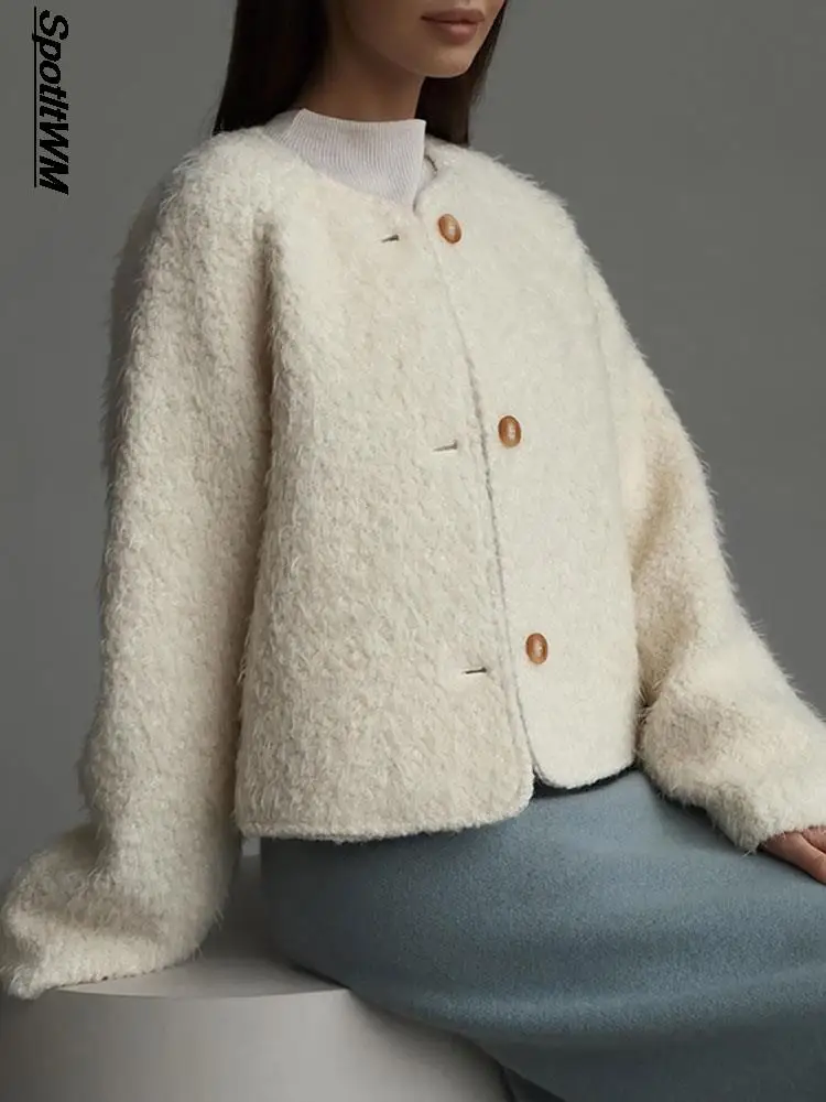 Зимняя шикарная шерстяная куртка для женщин, свободные универсальные плюшевые пальто с круглым вырезом и металлическими пуговицами, модная теплая Офисная Женская верхняя одежда с длинным рукавом