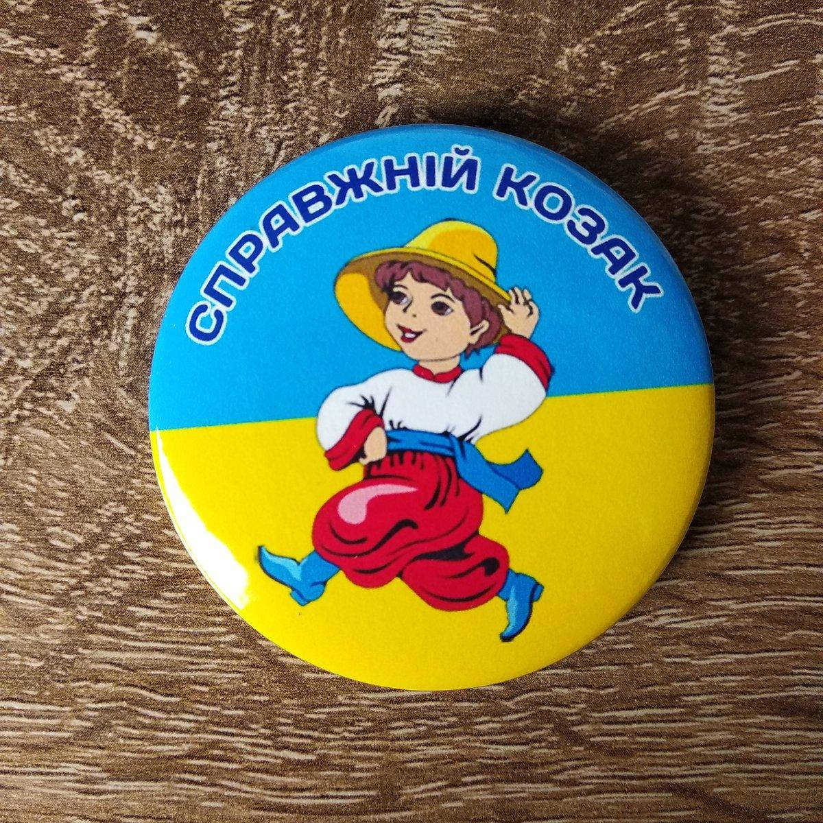 Металлический закатной значок с надписью "Справжній козак". На значке также нанесён жёлто-голубой фон с рисунком мальчика в украинском национальном костюме. Изготавливается значок на собственном оборудовании диаметром 50 или 58 мм, а также в таких вариантах: