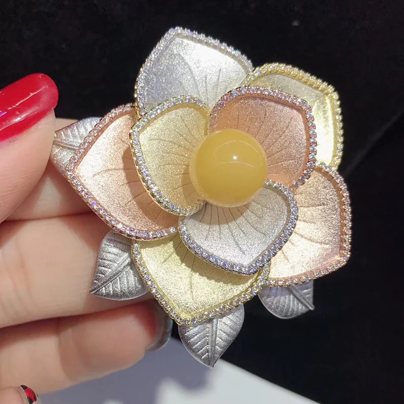 Золотая, серая, розовая брошь в виде камелии с градиентом для элегантного женского платья, пальто, аксессуары, циркониевая Подарочная брошь