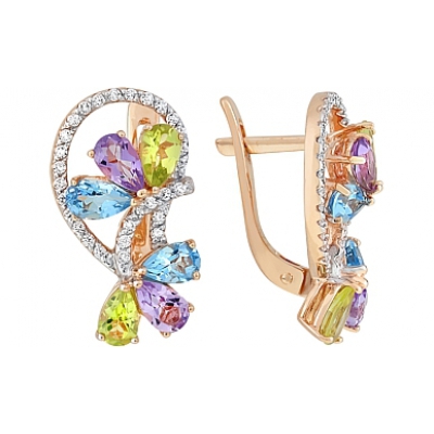 Серьги с аметистом, топазом, хризолитом и фианитом. Красное золото 585 проба. Средний вес 4,859 гр. Ширина: 11 мм. Высота: 20 мм. 58 фианитов, суммарный средний вес камней 0.087 карат, 4 аметиста, суммарный средний вес камней 0.794 карат, 4 топаза, суммарный средний вес камней 1.072 карат, 4 хризолита, суммарный средний вес камней 0.855 карат.