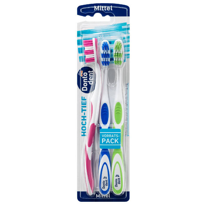 Зубная щетка Dontodent с щетинками трех уровней длины high-low, medium обеспечивает оптимальную очистку даже труднодоступных участков полости рта. Более длинная щетина идеально подходит для очистки промежутков между зубами, а короткие щетинки тщательно очищают поверхность зубов.