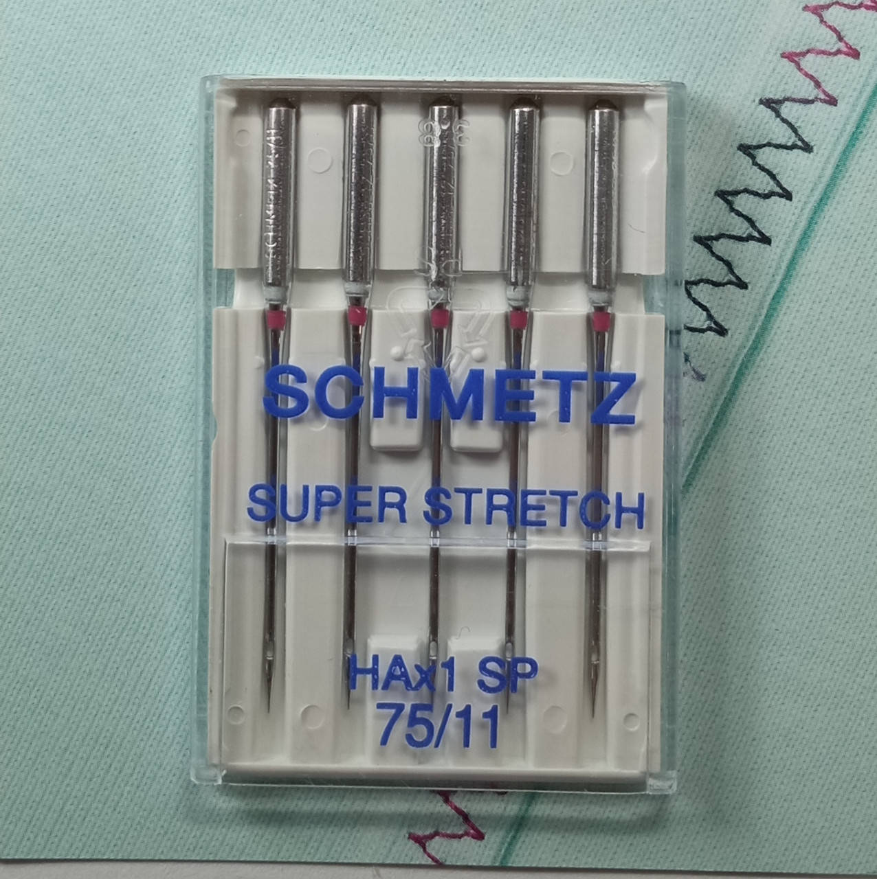 Иглы для бытовых швейных машин 130/705 Super Stretch 75 немецкой торговой марки SCHMETZ для шитья стретчевого материала, лайкры и любого другого эластичного, плотного или тонкого трикотажа, в комплекте 5 штук иголок. - №75. Применяются в бытовых швейных машинах разных торговых брендах. Срезанная колба.