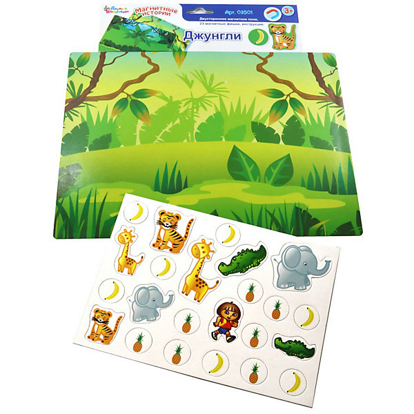 • в наборе: двустороннее магнитное поле (29,5х22 см), магниты персонажи-животные – 8 шт., магниты овощи-фрукты-ягоды – 14 шт., магнит-девочка – 1 шт., инструкция с примерами игр