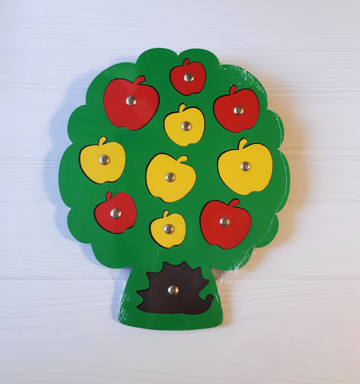 Игра с магнитами представляет собой фанерную доску с вкладышами - плодами деревьев - яблоками. Яблоки на дереве представлены в двух цветах (красные и желтые) и в пяти разных размерах. Игра развивает глазомер, т.к. совсем непросто подобрать яблоку подходящее место на дереве. На каждом вкладыше есть гладкая железная шляпка-заклепка, а к доске прилагается деревянная удочка с магнитом на конце. Магниты сильные, яблоки не сорвутся.