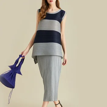 LANMREM 2020 Summer New Fashion Women Loose Plus Casual Pleated Sleeveless Striped Knit Vest Skirt Suit TC220
