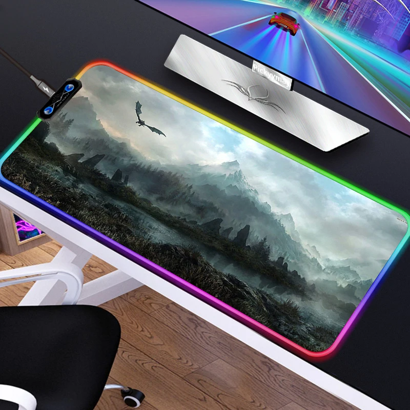 Игровой коврик для мыши RGB, большой коврик для мыши, игровой коврик для мыши с логотипом Skyrim, большой Настольный коврик для ПК, игровой светод...