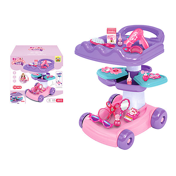 • в комплекте: столик, 1 фен, 1 безопасные ножницы, 2 зеркала, 2 расчёски, 1 заколка, 1 солнечные очки, 2 коробочки с изображением косметики, 1 браслет, 4 различных флакончика