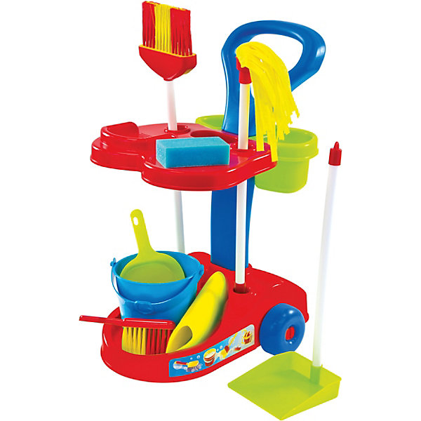 Передвижная тележка с ручкой наполнена тематическими аксессуарами для уборки помещения. Каждый предмет хорошо детализирован, имеет крупный размер для удобного пользования детьми. В процессе игры ребенок узнает и запоминает названия вещей, их предназначение. Набор развивает воображение. Сделано из безопасных материалов.