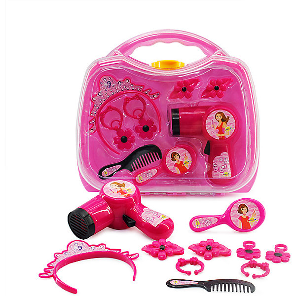 Игровой набор направлен на развитие чувства стиля, логики, воображения и мышления. Все предметы размещены в удобном чемоданчике, который можно брать с собой. Фен может выдувать воздух, как настоящий прибор.