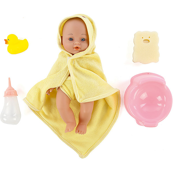 • комплект: кукла, горшок, бутылочка, мочалка, уточка, трусики, накидка-полотенце;