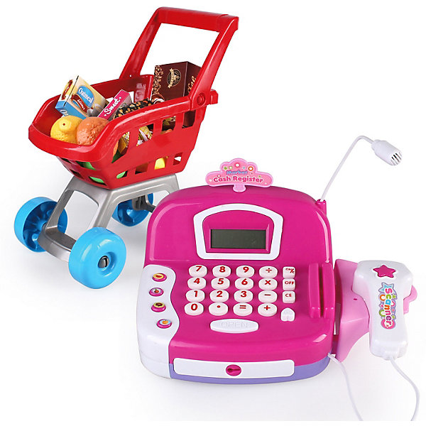 • в наборе: кассовый аппарат, тележка, корзинка, продукты, игровые деньги, функциональный микрофон, аксессуары