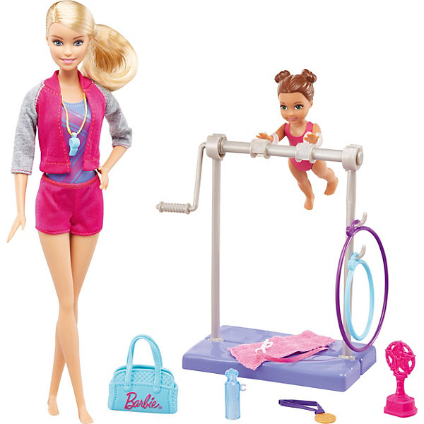 Игровой набор из серии «Барби-гимнастка» Mattel Barbie включает все необходимое для создания игровой сцены, в которой Барби становится тренером по гимнастике. Кукла одета в советующую форму, ручки и ножки подвижны. В наборе есть пупсик-девочка, которую Барби обучает спортивным приемам.